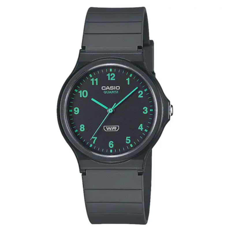 Japoński zegarek unisex Casio Timeless MQ-24B-8BEF. Model z mechanizmem kwarcowym. Koperta została wykonana z tworzywa sztucznego w kolorze czarnym. Pasek został wykonany z tworzywa sztucznego w kolorze czarnym. Czarną tarczę z zielonymi indeksami chroni szkło hesalitowe. Średnica koperty wynosi 35mm natomiast grubość 8mm. Klasa wodoszczelności tego modelu wynosi 3ATM.