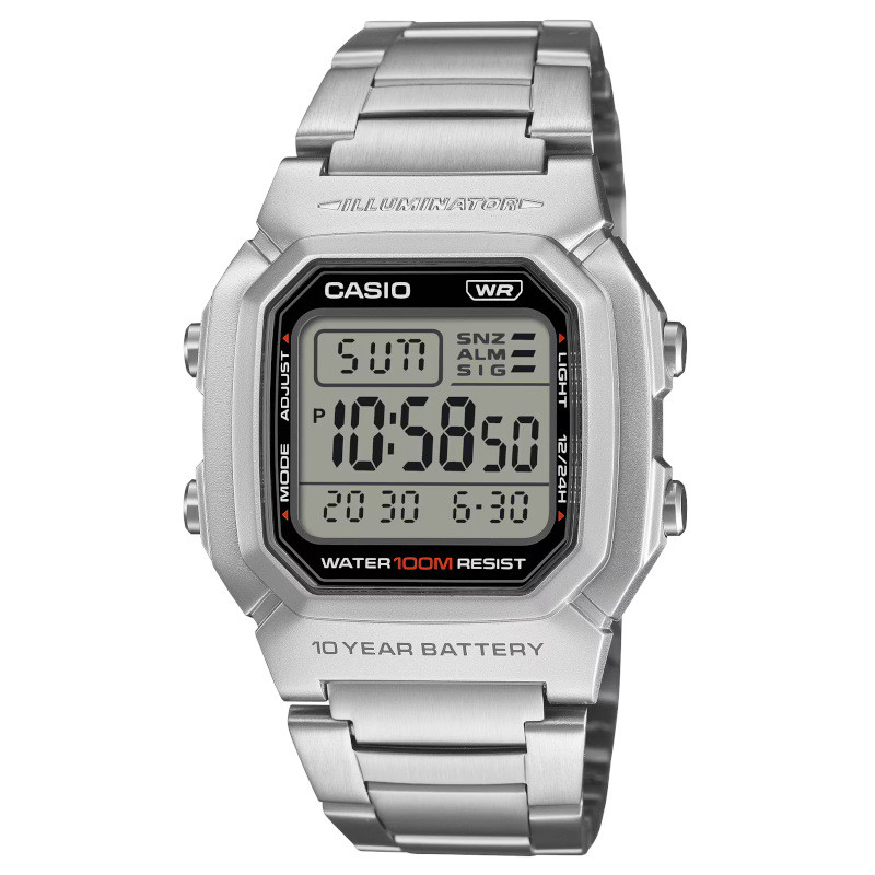 Sportowy zegarek męski Casio Timeless W-800HD-1AVEF. Model z mechanizmem kwarcowym. Koperta została wykonana z tworzywa sztucznego. Bransoleta została wykonana ze stali szlachetnej. Wyświetlacz chroni szkło hesalitowe. Wymiary koperty wynoszą 44.2 × 36.8 × 13.4 mm. Klasa wodoszczelności tego modelu wynosi 10ATM.