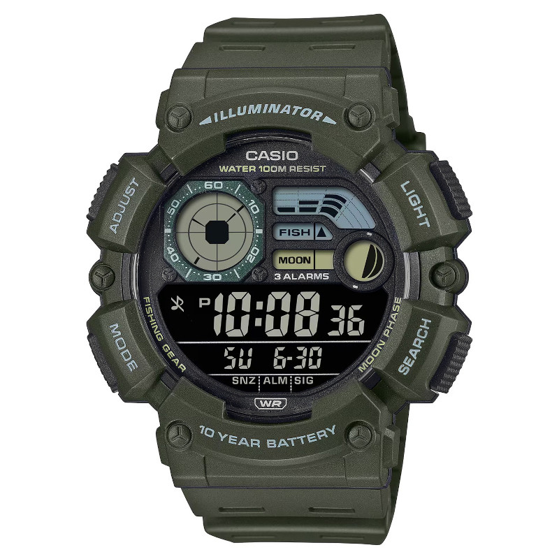 Sportowy zegarek męski CASIO Moonphase WS-1500H-3BVEF. Model z mechanizmem kwarcowym. Koperta została wykonana z tworzywa sztucznego. Oliwkowy pasek został wykonany z tworzywa sztucznego. Tarczę z wyświetlaczem chroni szkło hesalitowe. Szerokość koperty wynosi 50mm natomiast grubość 16,8mm. Klasa wodoszczelności tego modelu wynosi 10ATM.