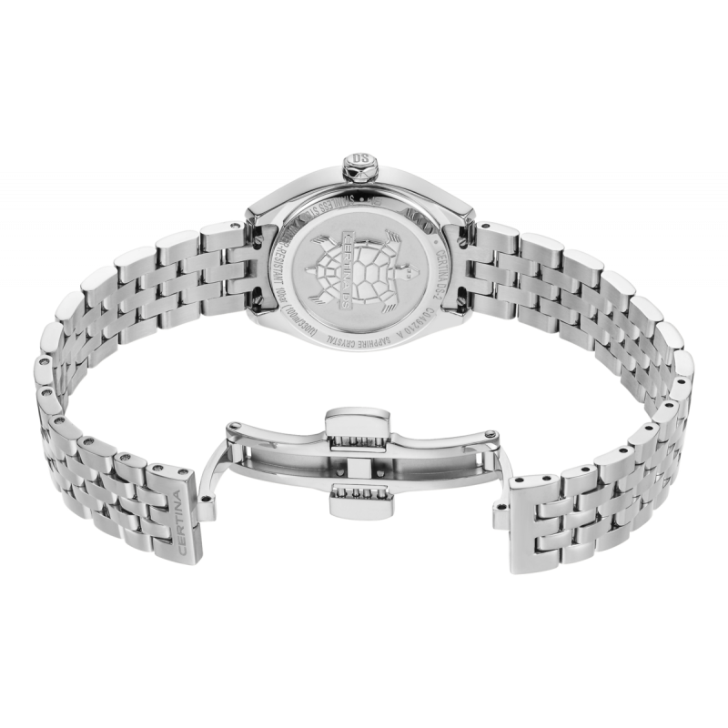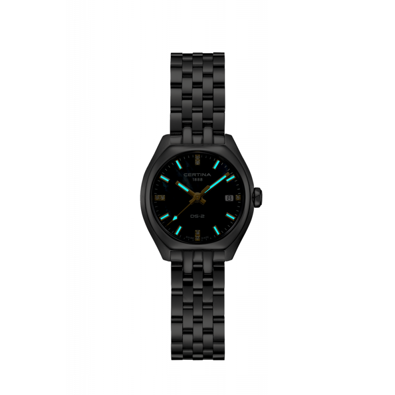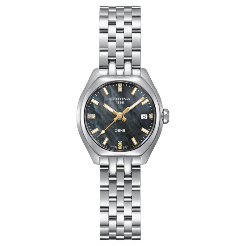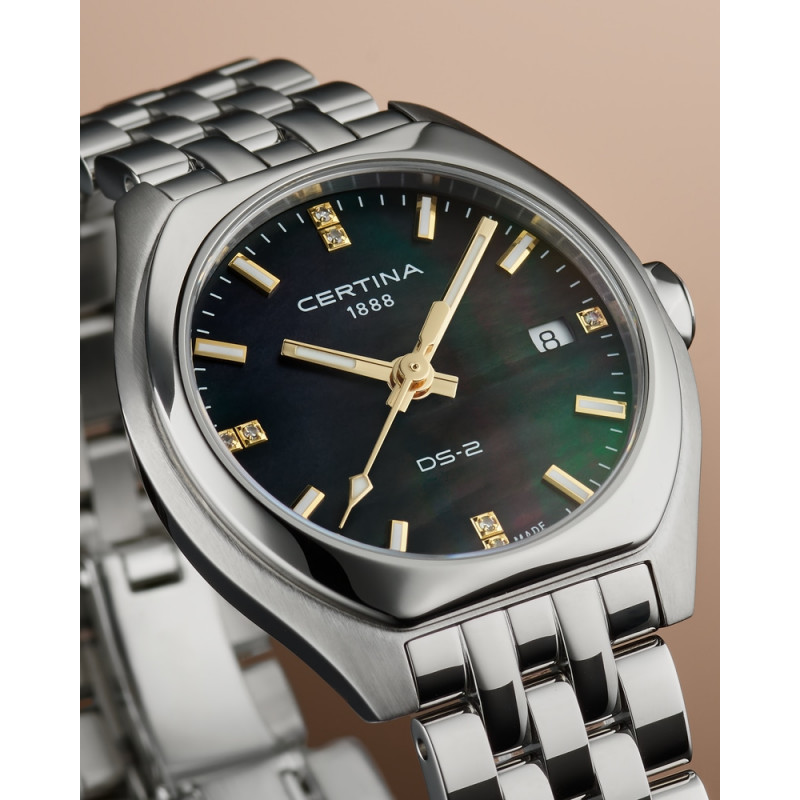 Szwajcarski elegancki zegarek damski Certina DS-2 C049.210.11.126.01. Model z precyzyjnym mechanizmem kwarcowym Precidrive z komplikacją datownika. Koperta została wykonana ze stali szlachetnej. Bransoleta została wykonana ze stali szlachetnej. Tarczę z ciemnej masy perłowej z  diamentami chroni najtwardsze, odporne na zarysowania szkło szafirowe z powłoką antyrefleksyjną po jednej stronie. Średnica koperty wynosi 27,8mm natomiast grubość 8,6mm. Klasa wodoszczelności tego modelu wynosi 10ATM.