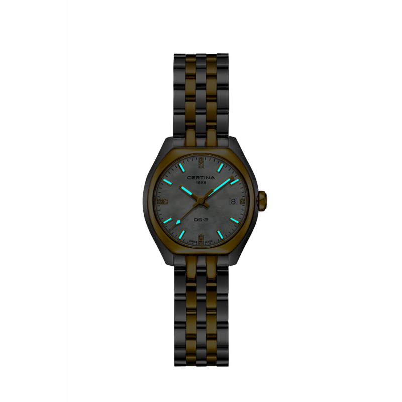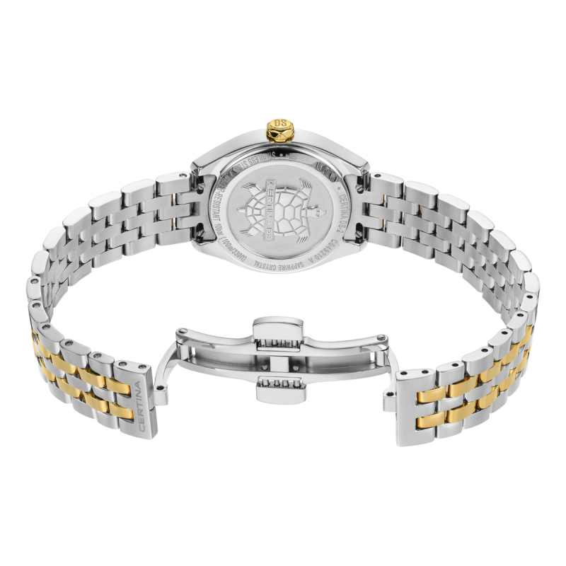 Szwajcarski elegancki zegarek damski Certina DS-2 C049.210.22.116.00. Model z precyzyjnym mechanizmem kwarcowym Precidrive z komplikacją datownika. Koperta została wykonana ze stali szlachetnej częściowo pokrytej powłoką w kolorze żółtego złota. Bransoleta została wykonana ze stali szlachetnej częściowo pokrytej powłoką w kolorze żółtego złota. Tarczę z masy perłowej z  diamentami chroni najtwardsze, odporne na zarysowania szkło szafirowe z powłoką antyrefleksyjną po jednej stronie. Średnica koperty wynosi 27,8mm natomiast grubość 8,6mm. Klasa wodoszczelności tego modelu wynosi 10ATM.