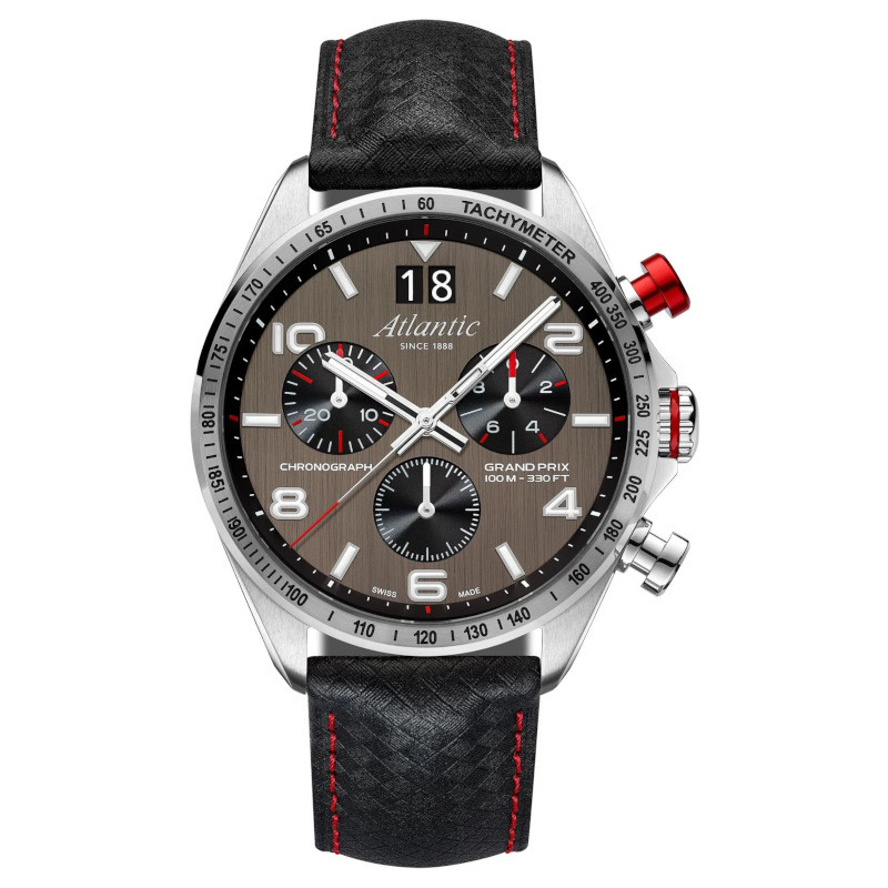 Szwajcarski sportowy zegarek męski Atlantic 55463.41.45 Grand Prix Chrono. Model z mechanizmem kwarcowym z komplikacją chronografu. Koperta została wykonana ze stali szlachetnej . Czarny pasek został uszyty ze skóry naturalnej. Grafitową tarczę chroni najtwardsze, odporne na zarysowania szkło szafirowe. Średnica koperty wynosi 44mm. Klasa wodoszczelności tego modelu wynosi 10ATM.