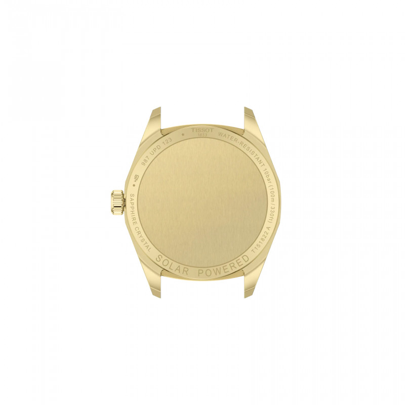 Szwajcarski elegancki zegarek damski Tissot PRC 100 Solar T151.822.33.021.00. Model z mechanizmem kwarcowym zasilanym energią słoneczną według technologii Lightmaster Solar. Koperta została wykonana ze stali szlachetnej pokrytej powłoką w kolorze złotym. Bransoleta została wykonana ze stali szlachetnej pokrytej powłoką w kolorze złotym. Złotą tarczę chroni najtwardsze, odporne na zarysowania szkło szafirowe. Średnica koperty wynosi 34mm natomiast grubość 9,14mm. Klasa wodoszczelności tego modelu wynosi 10ATM.