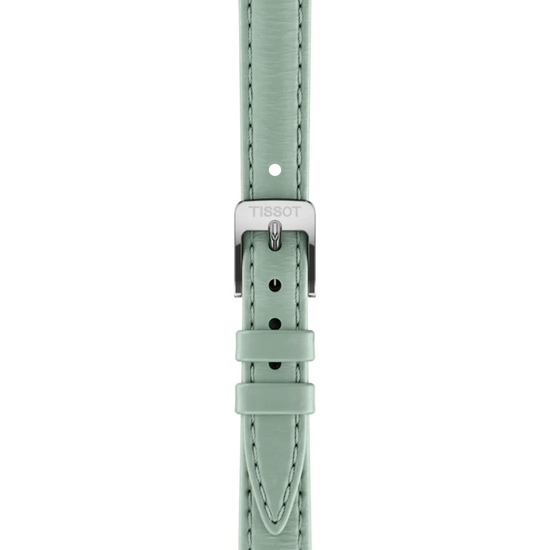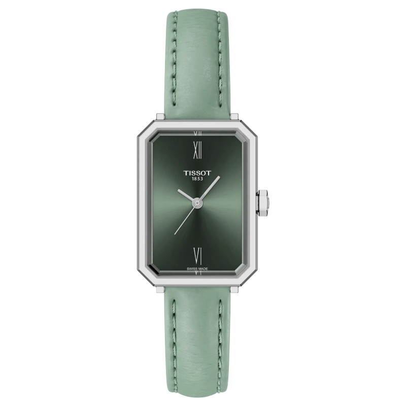 Szwajcarski elegancki zegarek damski Tissot SRV T160.110.16.093.00. Model z precyzyjnym mechanizmem kwarcowym. Koperta została wykonana ze stali szlachetnej. Zielony pasek został uszyty z ziarnistej skory bydlęcej stylizowanej na skórę aligatora. Zieloną tarczę chroni najtwardsze, odporne na zarysowania fasetowane szkło szafirowe. Szerokość koperty wynosi 21,8mm natomiast grubość 7,25mm. Klasa wodoszczelności tego modelu wynosi 5ATM.