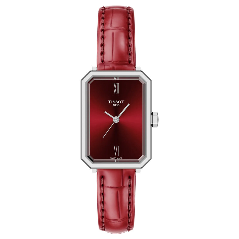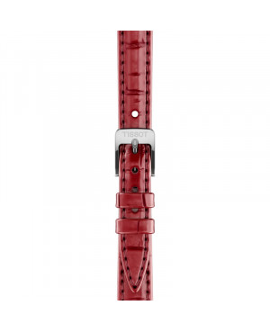 Szwajcarski elegancki zegarek damski Tissot SRV T160.110.16.423.00. Model z precyzyjnym mechanizmem kwarcowym. Koperta została wykonana ze stali szlachetnej. Czerwony pasek został uszyty z ziarnistej skory bydlęcej stylizowanej na skórę aligatora. Czerwoną tarczę chroni najtwardsze, odporne na zarysowania fasetowane szkło szafirowe. Szerokość koperty wynosi 21,8mm natomiast grubość 7,25mm. Klasa wodoszczelności tego modelu wynosi 5ATM.