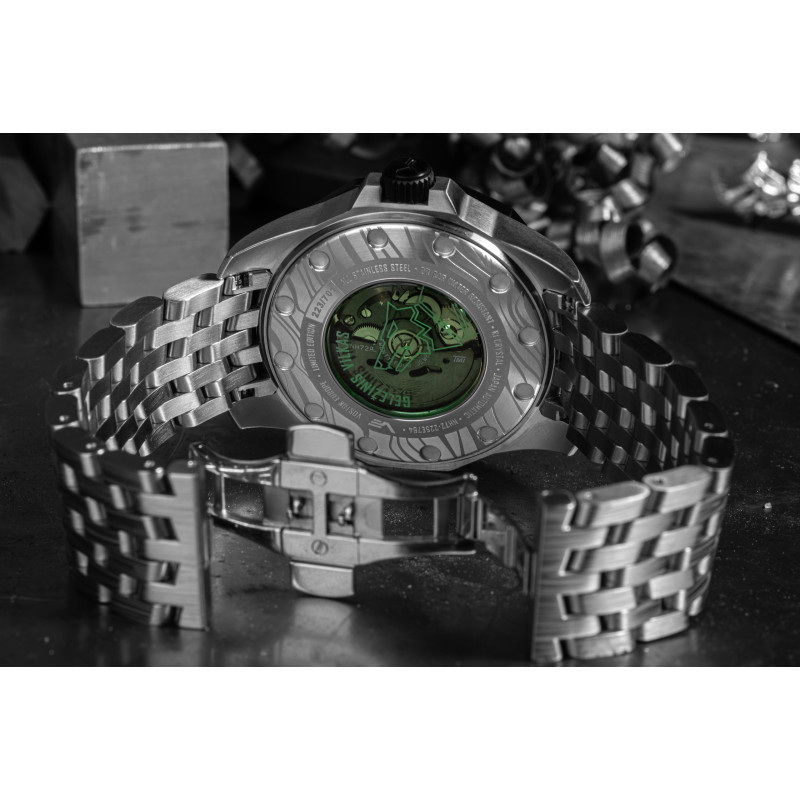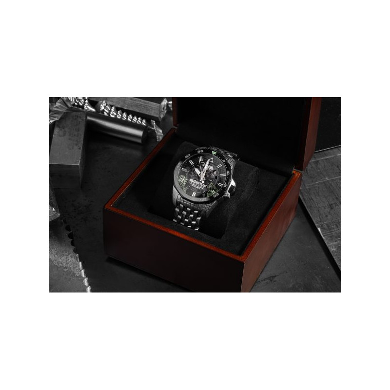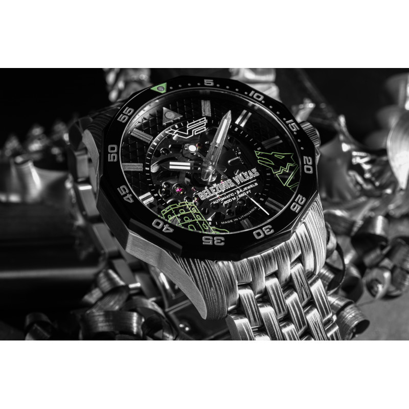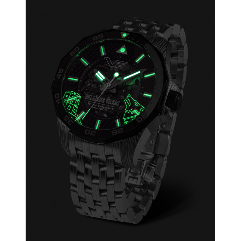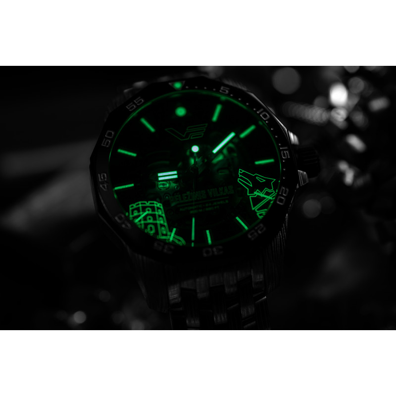 Zegarek Vostok Europe NH72/225E764 B-Iron to limitowana edycja (701 sztuk) na rok 2024, która łączy brutalną elegancję z nowoczesną precyzją. Jego design inspirowany jest legendą o powstaniu Wilna i Żelaznym Wilku – mitycznym stworzeniem, które pojawiło się w śnie Wielkiego Księcia Giedymina. Zegarek posiada kopertę ze stali nierdzewnej 316L z grawerunkiem „Wilczej wełny”, ceramiczny pierścień na bezelu oraz szkieletowy mechanizm japońskiej produkcji, widoczny przez zielone szkło dekla. Dodatkowo, na wewnętrznej stronie szkła widnieje świetlisty symbol Wieży Giedymina i wilczej głowy, co czyni ten model wyjątkowym. Całość dostarczana jest w drewnianym opakowaniu.