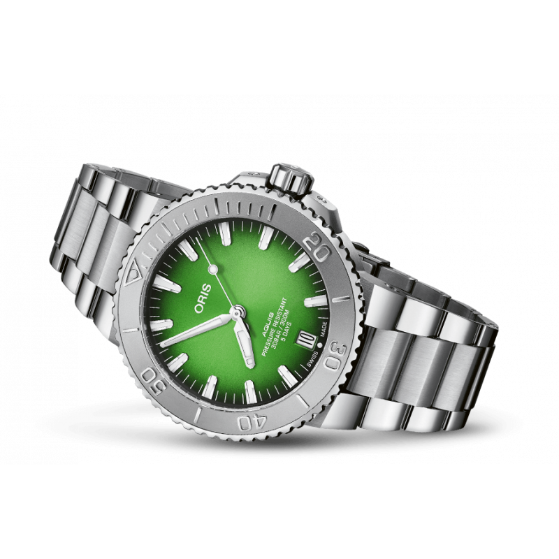 Szwajcarski, męski zegarek do nurkowania ORIS Aquis Payoon Limited Edition 01 400 7763 4117-Set. Zegarek posiada precyzyjny mechanizm automatyczny własnego projektu i wykonania ORIS CALIBRE 400. Mechanizm posiada rezerwę chodu 5 dni, jest odporny na pola magnetyczne, a zegarek wyposażony w ten mechanizm, po rejestracji na stronie producenta otrzymuje 10 lat gwarancji. Koperta oraz bransoleta zostały wykonane ze stali szlachetnej. Odporne na zarysowania sferyczne szkło szafirowe. Średnica koperty wynosi 43,5 mm. Zegarke ma bardzo dużą wodoodporność 300 metrów, dzięki której można pływać i nurkować z zegarkiem na nadgarstku. Prezentowany model został poświęcony zagrożonemu wyginięciem gatunku Diugonia przybrzeżnego. Edycja limitowana tylko 250 sztuk.