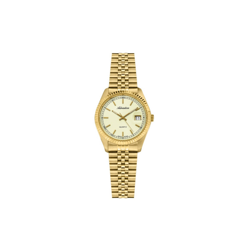 Szwajcarski klasyczny zegarek damski Adriatica A3090.1111Q. Model z precyzyjnym mechanizmem kwarcowym z komplikacją datownika. Koperta została wykonana ze stali szlachetnej pokrytej powłoką w kolorze złotym. Bransoleta została wykonana ze stali szlachetnej pokrytej powłoką w kolorze złotym. Złotą tarczę chroni szkło szafirowe. Szerokość koperty wynosi 30mm natomiast grubość 10mm. Klasa wodoszczelności tego modelu wynosi 5ATM.