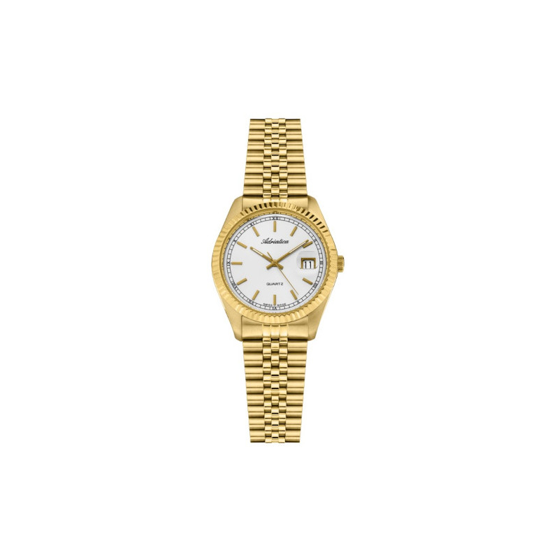 Szwajcarski klasyczny zegarek damski Adriatica A3090.1113Q. Model z precyzyjnym mechanizmem kwarcowym z komplikacją datownika. Koperta została wykonana ze stali szlachetnej pokrytej powłoką w kolorze złotym. Bransoleta została wykonana ze stali szlachetnej pokrytej powłoką w kolorze złotym. Białą tarczę chroni szkło szafirowe. Szerokość koperty wynosi 30mm natomiast grubość 10mm. Klasa wodoszczelności tego modelu wynosi 5ATM.
