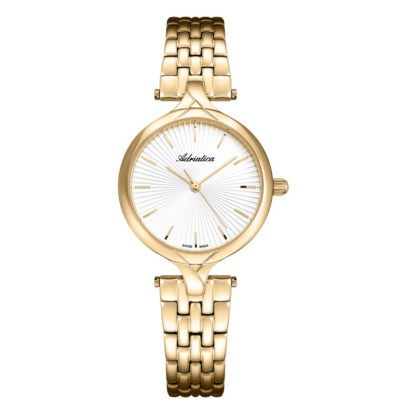 Szwajcarski elegancki zegarek damski Adriatica Classic A3825.1113Q. Model z precyzyjnym mechanizmem kwarcowym. Koperta została wykonana ze stali szlachetnej pokrytej powłoką w kolorze złotym. Bransoleta została wykonana ze stali szlachetnej pokrytej powłoką w kolorze złotym. Białą tarczę chroni szkło mineralne. Średnica koperty wynosi 30mm natomiast grubość 7mm. Klasa wodoszczelności tego modelu wynosi 3ATM.