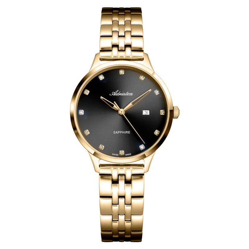 Szwajcarski elegancki zegarek damski Adriatica A3831.1144Q. Model z precyzyjnym mechanizmem kwarcowym z komplikacją datownika. Koperta została wykonana ze stali szlachetnej pokrytej powłoką w kolorze złotym. Bransoleta została wykonana ze stali szlachetnej pokrytej powłoką w kolorze złotym. Czarną tarczę z cyrkoniami, chroni najtwardsze, odporne na zarysowania szkło szafirowe. Szerokość koperty wynosi 32mm natomiast grubość 7mm. Klasa wodoszczelności tego modelu wynosi 3ATM.