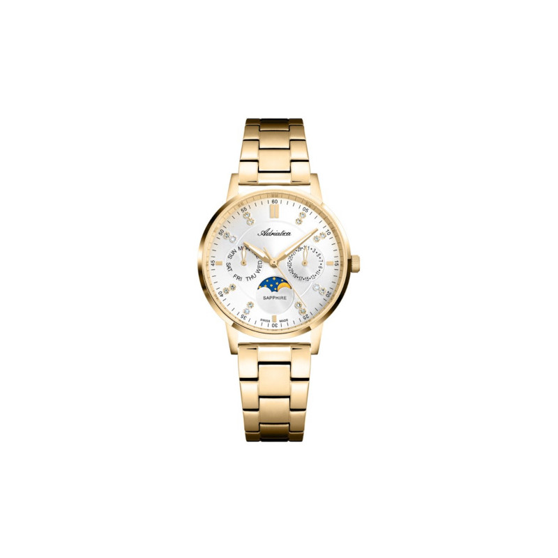 Szwajcarski elegancki zegarek damski Adriatica A3834.1193QF. Model z precyzyjnym mechanizmem kwarcowym z komplikacją datownika oraz fazami księżyca. Koperta została wykonana ze stali szlachetnej pokrytej powłoką w kolorze złotym. Bransoleta została wykonana ze stali szlachetnej pokrytej powłoką w kolorze złotym. Srebrną tarczę z cyrkoniami, chroni najtwardsze, odporne na zarysowania szkło szafirowe. Szerokość koperty wynosi 34mm natomiast grubość 9mm. Klasa wodoszczelności tego modelu wynosi 3ATM.