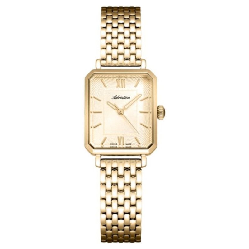 Szwajcarski elegancki zegarek damski Adriatica A3838.1111Q. Model z precyzyjnym mechanizmem kwarcowym. Koperta została wykonana ze stali szlachetnej pokrytej powłoką w kolorze złotym. Bransoleta została wykonana ze stali szlachetnej pokrytej powłoką w kolorze złotym. Złotą tarczę chroni szkło mineralne. Szerokość koperty wynosi 22mm natomiast grubość 7mm. Klasa wodoszczelności tego modelu wynosi 3ATM.