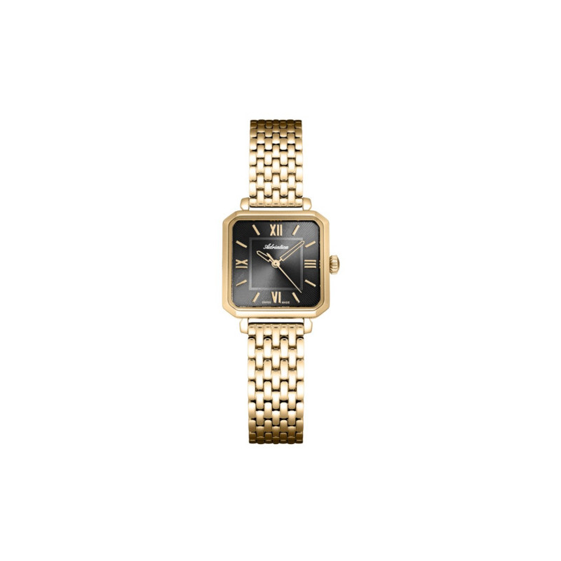 Szwajcarski elegancki zegarek damski Adriatica A3839.1166Q. Model z precyzyjnym mechanizmem kwarcowym. Koperta została wykonana ze stali szlachetnej pokrytej powłoką w kolorze złotym. Bransoleta została wykonana ze stali szlachetnej pokrytej powłoką w kolorze złotym. Czarną tarczę chroni szkło mineralne. Szerokość koperty wynosi 24x24mm natomiast grubość 7mm. Klasa wodoszczelności tego modelu wynosi 3ATM.