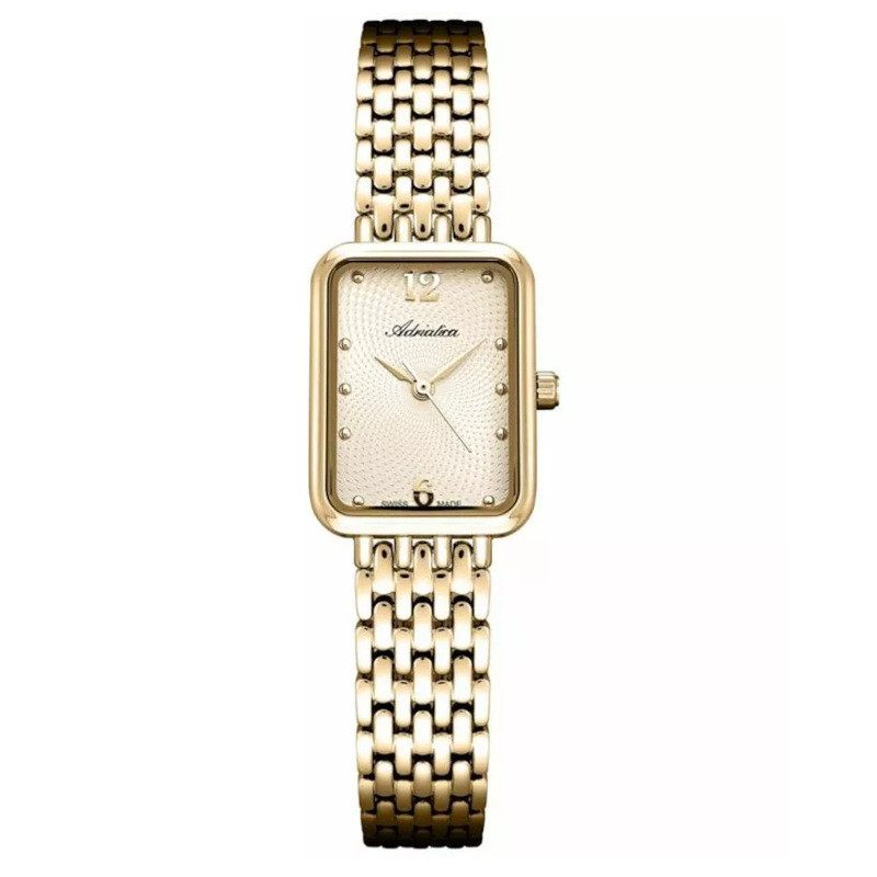 Szwajcarski elegancki zegarek damski Adriatica A3849.1171Q. Model z mechanizmem kwarcowym. Koperta została wykonana ze stali szlachetnej pokrytej powłoką w kolorze złotym. Bransoleta została wykonana ze stali szlachetnej pokrytej powłoką w kolorze złotym. Złotą ozdobnie giloszowaną tarczę chroni szkło mineralne. Szerokość koperty wynosi 20mm natomiast grubość 7mm. Klasa wodoszczelności tego modelu wynosi 3ATM.