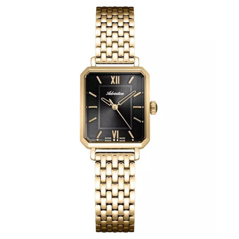 Szwajcarski elegancki zegarek damski Adriatica A3838.1116Q. Model z precyzyjnym mechanizmem kwarcowym. Koperta została wykonana ze stali szlachetnej pokrytej powłoką w kolorze złotym. Bransoleta została wykonana ze stali szlachetnej pokrytej powłoką w kolorze złotym. Czarną tarczę chroni szkło mineralne. Szerokość koperty wynosi 22mm natomiast grubość 7mm. Klasa wodoszczelności tego modelu wynosi 3ATM.