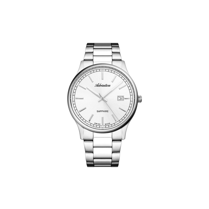 Szwajcarski elegancki zegarek męski Adriatica A1293.5113Q. Model z mechanizmem kwarcowym z komplikacją datownika. Koperta została wykonana ze stali szlachetnej. Bransoleta została wykonana ze stali szlachetnej.  Srebrną tarczę chroni najtwardsze, odporne na zarysowania szkło szafirowe. Średnica koperty wynosi 42mm natomiast grubość 8mm. Klasa wodoszczelności tego modelu wynosi 3ATM.