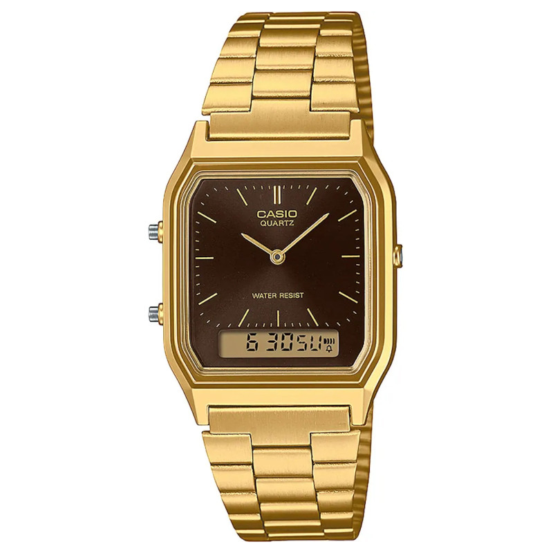 Modowy zegarek męski Casio Vintage AQ-230GA-5AMQYES. Model z precyzyjnym mechanizmem kwarcowym. Koperta została wykonana z tworzywa sztucznego. Bransoleta została wykonana ze stali szlachetnej pokrytej powłoką w kolorze złotym. Brązową tarczę chroni szkło hesalitowe. Szerokość koperty wynosi 29mm natomiast grubość 8mm. Klasa wodoszczelności tego modelu wynosi 3ATM.
