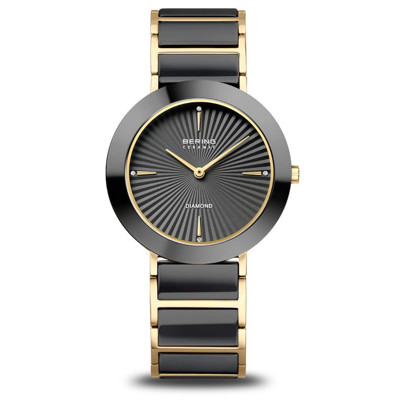 Elegancki zegarek damski Bering Ceramic 11435-732. Model z mechanizmem kwarcowym. Koperta została wykonana ze stali szlachetnej pokrytej powłoką w kolorze złotym. Bezel został wykonany z ceramiki. Bransoleta została wykonana z połączenia ceramiki i stali szlachetnej pokrytej powłoką w kolorze złotym. Szarą tarczę z diamentami chroni najtwardsze, odporne na zarysowania szkło szafirowe. Średnica koperty wynosi 35mm natomiast grubość 6mm. Klasa wodoszczelności tego modelu wynosi 3ATM.