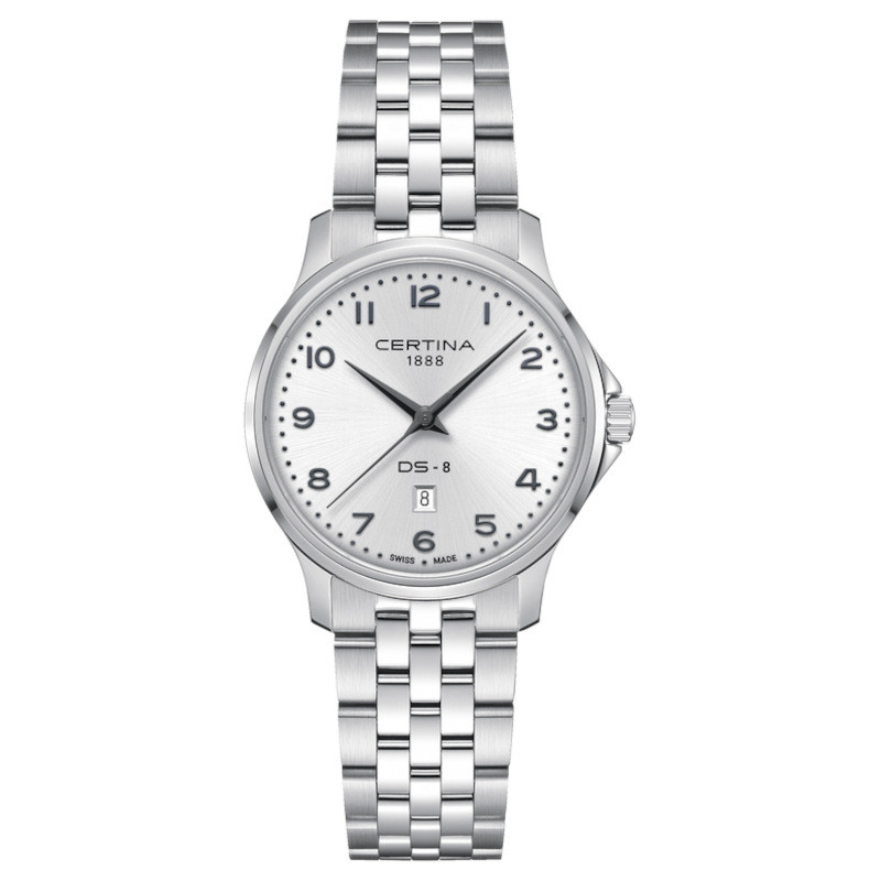 Szwajcarski klasyczny zegarek damski Certina DS-8 C045.010.11.032.00. Model z precyzyjnym szwajcarskim mechanizmem kwarcowym Precidrive z komplikacją datownika. Koperta została wykonana ze stali szlachetnej. Bransoleta została wykonana ze stali szlachetnej. Tarczę chroni najtwardsze, odporne na zarysowania szkło szafirowe z wewnętrzną powłoką antyrefleksyjną. Średnica koperty wynosi 31mm natomiast grubość 7,95mm. Klasa wodoszczelności tego modelu wynosi 10ATM.