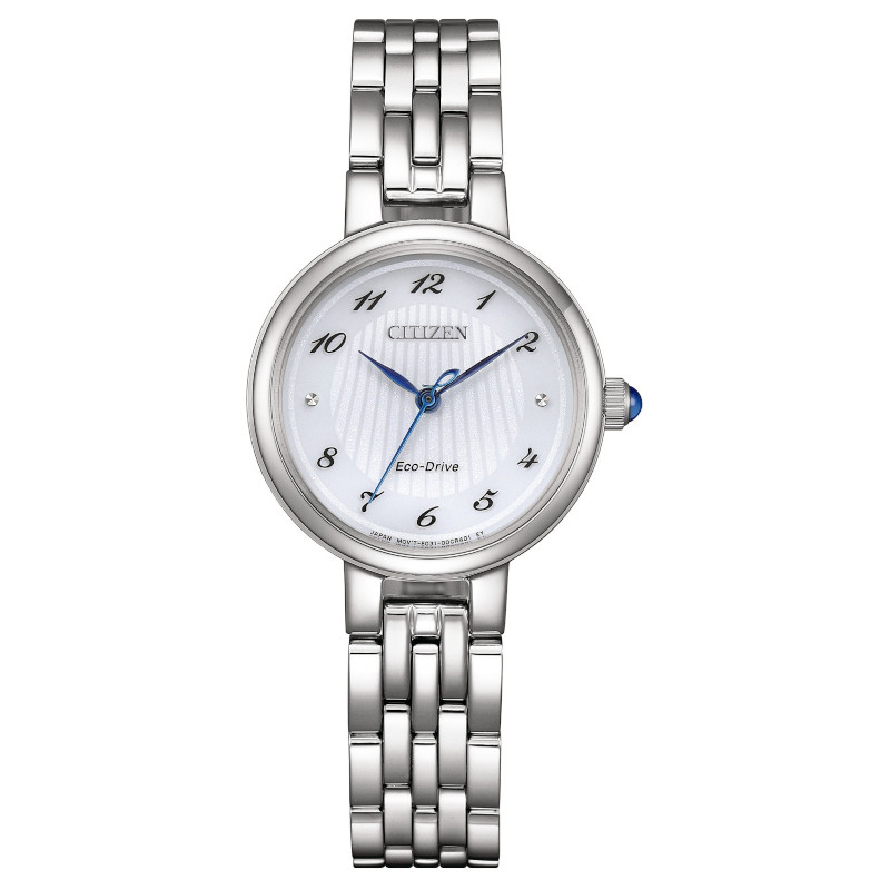 Japoński elegancki zegarek damski Citizen Lady EM0990-81A. Model z mechanizmem solarnym Eco-Drive. Koperta została wykonana ze stali szlachetnej. Bransoleta została wykonana ze stali szlachetnej. Białą tarczę chroni najtwardsze, odporne na zarysowania szkło szafirowe. Średnica koperty wynosi 27,7mm natomiast grubość 7,3mm. Klasa wodoszczelności tego modelu wynosi 5ATM.