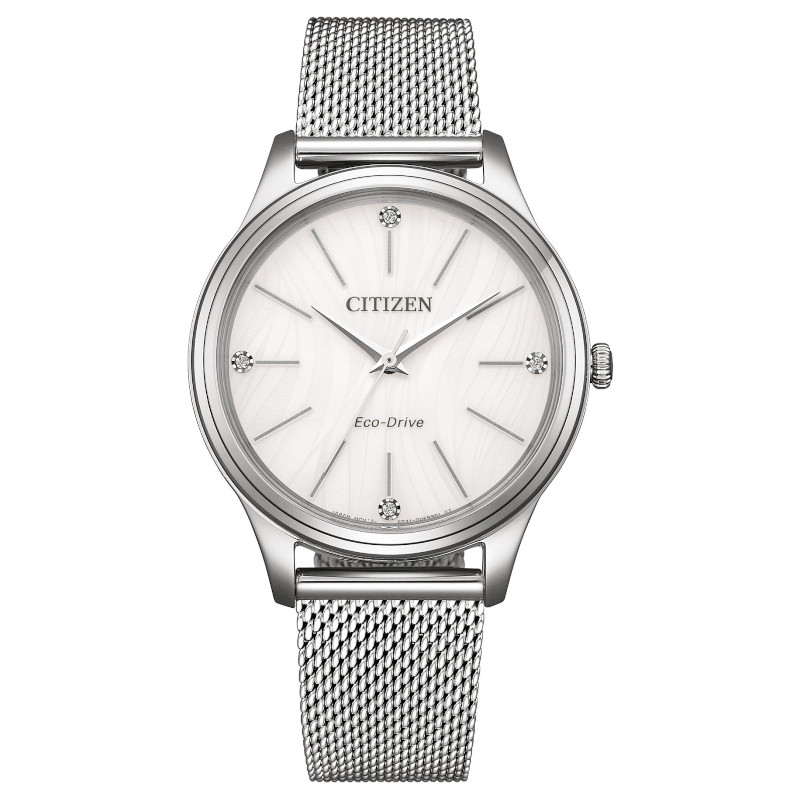 Elegancki zegarek damski Citizen Eco-Drive EM1220-82A. Model z mechanizmem kwarcowym zasilanym energią słoneczną (Eco-Drive). Koperta została wykonana ze stali szlachetnej. Bransoleta typu mesh została wykonana ze stali szlachetnej. Białą tarczę chroni szkło mineralne. Średnica koperty wynosi 34mm. Klasa wodoszczelności tego modelu wynosi 5ATM.
