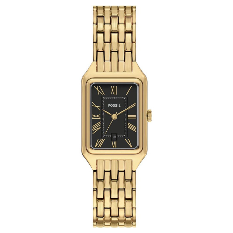 Elegancki zegarek damski Fossil Raquel ES5434. Model z mechanizmem kwarcowym. Koperta została wykonana ze stali szlachetnej pokrytej powłoką w kolorze złotym. Bransoleta została wykonana ze stali szlachetnej pokrytej powłoką w kolorze złotym. Czarną tarczę chroni szkło mineralne. Średnica koperty wynosi 23mm. Klasa wodoszczelności tego modelu wynosi 5ATM.