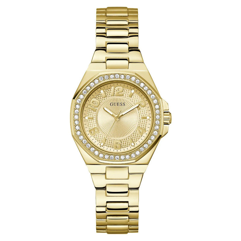 Modowy zegarek damski Guess Contessa GW0877L2. Model z mechanizmem kwarcowym. Koperta ozdobiona cyrkoniami została wykonana ze stali szlachetnej pokrytej powłoką w kolorze złotym. Bransoleta została wykonana ze stali szlachetnej pokrytej powłoką w kolorze złotym. Złotą tarczę chroni szkło mineralne. Średnica koperty wynosi 34mm natomiast grubość 9mm. Klasa wodoszczelności tego modelu wynosi 3ATM.