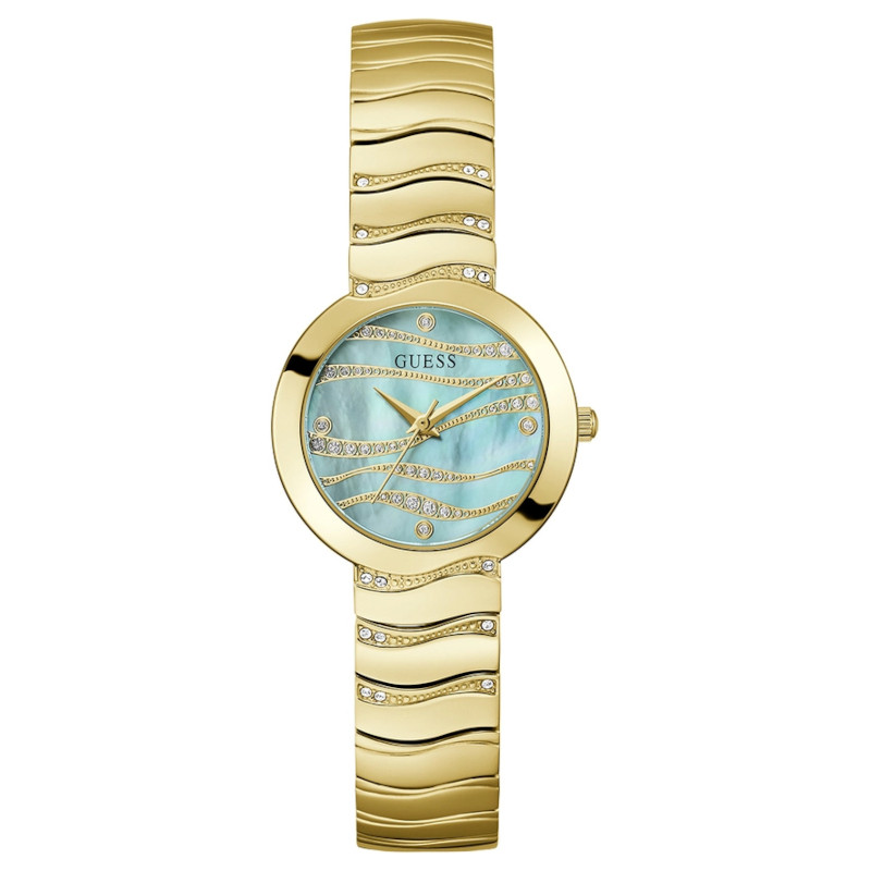 Modowy zegarek damski Guess Laguna GW0871L2. Model z mechanizmem kwarcowym. Koperta została wykonana ze stali szlachetnej pokrytej powłoką w kolorze złotym. Bransoleta ozdobiona cyrkoniami została wykonana ze stali szlachetnej pokrytej powłoką w kolorze złotym. Niebieską tarczę z cyrkoniami chroni szkło mineralne. Szerokość koperty wynosi 30mm natomiast grubość 8mm. Klasa wodoszczelności tego modelu wynosi 3ATM.
