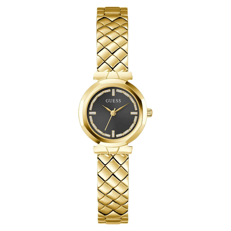 Modowy zegarek damski Guess Mini Rumour GW0839L2. Model z mechanizmem kwarcowym. Koperta została wykonana ze stali szlachetnej pokrytej powłoką w kolorze złotym. Bransoleta została wykonana ze stali szlachetnej pokrytej powłoką w kolorze złotym. Czarną tarczę chroni szkło mineralne. Szerokość koperty wynosi 26mm. Klasa wodoszczelności tego modelu wynosi 3ATM.