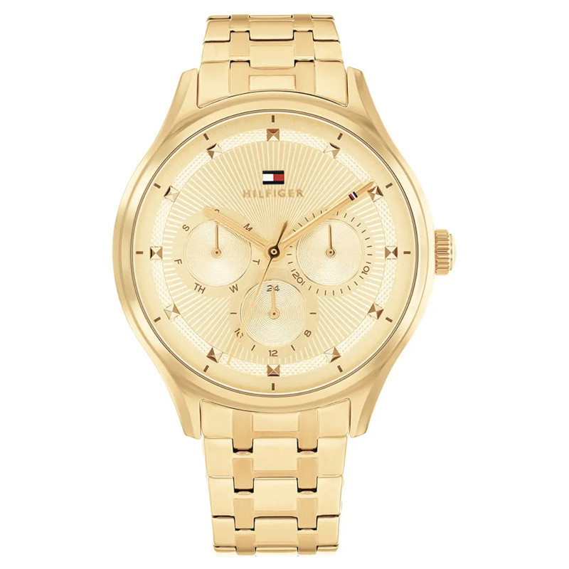 Modowy zegarek damski Tommy Hilfiger Gianna 1782751. Model z mechanizmem kwarcowym z komplikacja datownika. Koperta została wykonana ze stali szlachetnej pokrytej powłoką w kolorze złotym. Bransoleta została wykonana ze stali szlachetnej pokrytej powłoką w kolorze złotym. Złotą tarczę chroni szkło mineralne. Średnica koperty wynosi 38mm natomiast grubość 6mm. Klasa wodoszczelności tego modelu wynosi 3ATM.