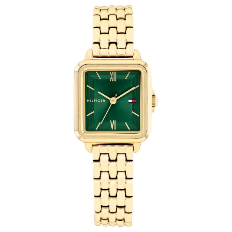 Modowy zegarek damski Tommy Hilfiger Mia 1782858. Model z mechanizmem kwarcowym. Koperta została wykonana ze stali szlachetnej pokrytej powłoką w kolorze złotym. Bransoleta została wykonana ze stali szlachetnej pokrytej powłoką w kolorze złotym. Zieloną tarczę chroni szkło mineralne. Szerokość koperty wynosi 23mm natomiast grubość 7mm. Klasa wodoszczelności tego modelu wynosi 3ATM.