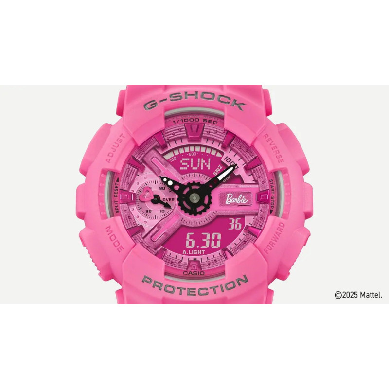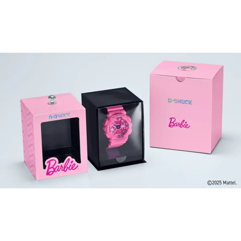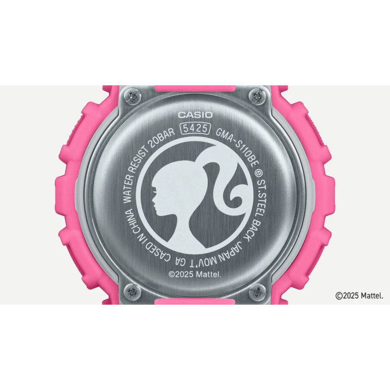 Casio GMA-S110BE-4AER G-SHOCK Barbie™ Collaboration to wyjątkowy zegarek łączący trwałość i funkcjonalność G-SHOCK z ikonicznym stylem Barbie™. Inspirowany ideą wzmacniania pewności siebie u kobiet, model wyróżnia się monochromatyczną, intensywnie różową kolorystyką z detalami, takimi jak logo Barbie™ i jej charakterystyczny profil Silohead. Całość dopełnia specjalne opakowanie nawiązujące do oryginalnego designu Barbie™, podkreślając kolekcjonerski charakter zegarka.