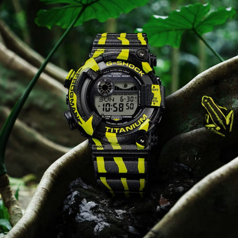 Sportowy zegarek męski do nurkowania CASIO G-Shock Master of G Sea Frogman GW-8200TPF-1ER. Zegarek posiada precyzyjny, wielofunkcyjny mechanizm kwarcowy zasilany światłem. Koperta została wykonana z tworzywa sztucznego i tytanu. pasek z tworzywa sztucznego. Szkło mineralne. Szerokość koperty wynosi 50,3mm. Zegarek jest przeznaczony do nurkowania. Posiada głębokościomierz oraz specjalne funkcje, jak pamięć ostatnich 10 nurkowań. Zegarek ma certyfikat ISO zegarka nurkowego. Poza tym jest odporny na wstrząsy i uderzenia. Kultowy model z rodziny G-Shock. Wersja specjalna utrzymana w kolorystyce przypominającej trującą żabę występującą w Ameryce Południowe. Dodatkowo fktura elementów koperty z tworzywa sztucznego oraz paska przypomina skórę żaby. Jeden z niewielu modeli "G" produkowanych wyłącznie w Japonii.
