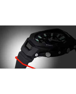 Przenieś swój codzienny trening na wyższy poziom, łącząc styl i wygodę, dzięki zegarkowi G-SHOCK. Odkryj więcej radości z treningu dzięki zegarkowi GBA-950, który oferuje szereg praktycznych funkcji wspierających Twój program treningowy. Użyj funkcji GPS w smartfonie, aby dostosować pomiary dystansu, a zegarek będzie śledził Twoje tempo nawet bez połączenia ze smartfonem. Funkcja Auto Lap automatycznie śledzi czasy pokonania określonego dystansu, a dzięki dedykowanej aplikacji możesz łatwo zarządzać danymi z dziennika aktywności, przeglądać historię aktywności i korzystać z wielu innych funkcji. Koperta i pasek są płynnie formowane w jeden element zewnętrzny, zapewniając solidną ochronę obudowy z żywicy wzmocnionej włóknem węglowym. Konstrukcja paska, zaprojektowana z myślą o maksymalnej elastyczności, zapewnia jeszcze wygodniejsze dopasowanie do nadgarstka. Dodatkowo, samoprzylepne mocowanie szkła pozwala na bardziej kompaktową konstrukcję uchwytów, podkreślając ostrą sylwetkę od koperty do paska. Nowy projekt paska został opracowany we współpracy z OUTSENSE Inc., liderem w dziedzinie „inżynierii origami”. Ich spostrzeżenia, zaczerpnięte ze sztuki składania papieru, zapewniają pasek o głębi i wymiarze oraz wyjątkowo wygodnym dopasowaniu. Precyzyjnie przeanalizowane kąty zagięć gór i dolin w dolnych sekcjach paska rozciągają się na lewo i prawo, zapewniając, że koperta ściśle przylega do nadgarstka na spodniej stronie falistej podstawy paska. Kluczowe komponenty żywiczne użyte w kopercie i pasku są również wykonane z biożywicy, materiału, który ma pomóc w zmniejszeniu wpływu na środowisko. Synchronizuj się ze swoim smartfonem przez Bluetooth®, aby uzyskać precyzyjny pomiar czasu, proste powiadomienia, liczbę kroków i wiele więcej. Oferując 2-letnią baterię, ten zegarek jest gotowy pomóc Ci we wszystkim, od zarządzania codziennym zdrowiem po zwiększenie wytrzymałości biegowej — wszystko w modnym, sportowym wyglądzie.