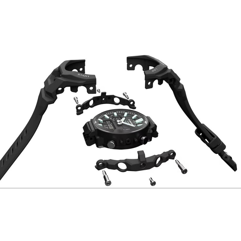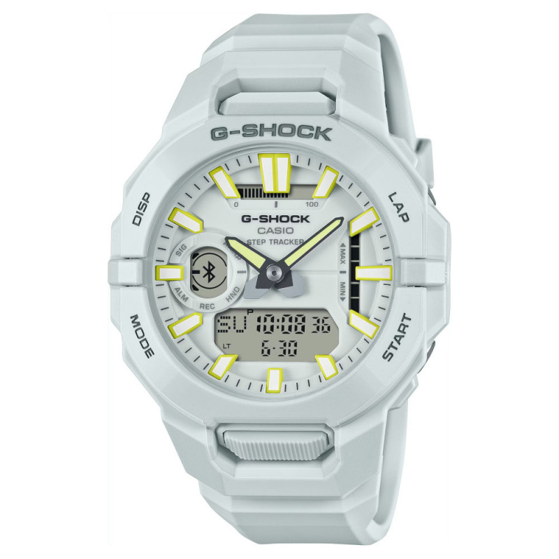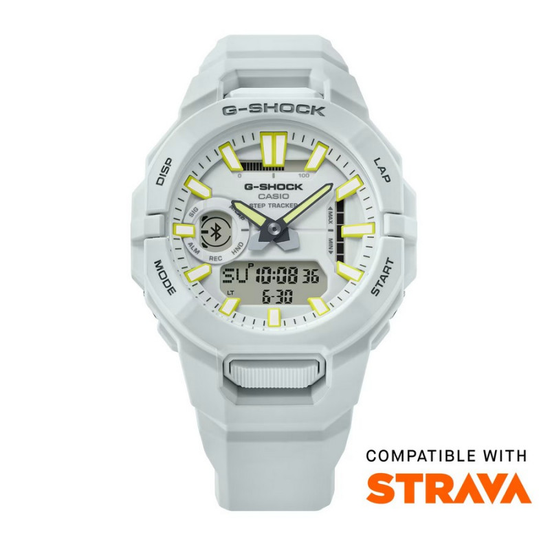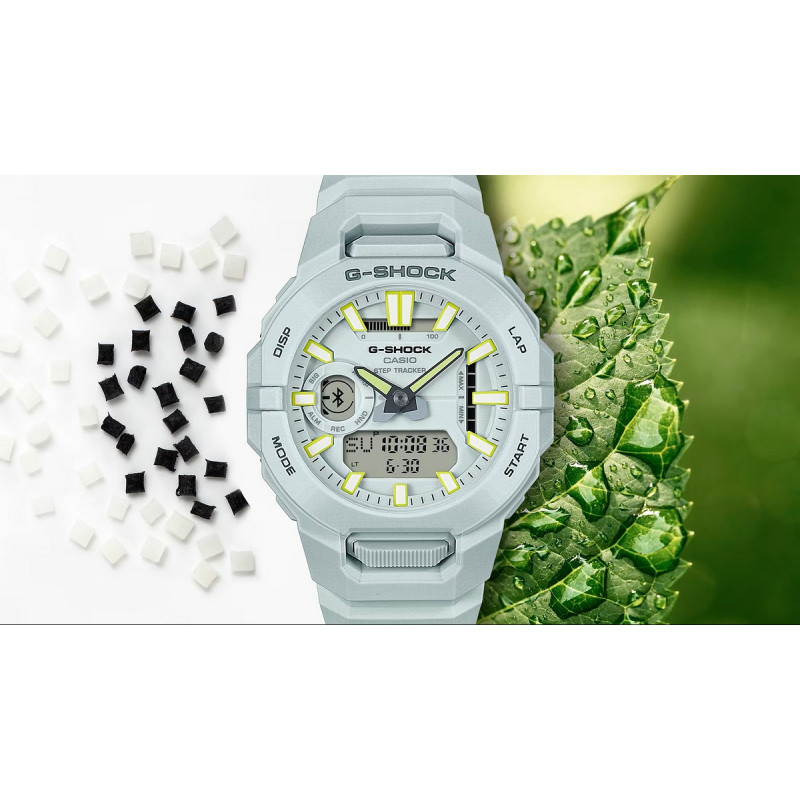 Przenieś swój codzienny trening na wyższy poziom, łącząc styl i wygodę, dzięki zegarkowi G-SHOCK. Odkryj więcej radości z treningu dzięki zegarkowi GBA-950, który oferuje szereg praktycznych funkcji wspierających Twój program treningowy. Użyj funkcji GPS w smartfonie, aby dostosować pomiary dystansu, a zegarek będzie śledził Twoje tempo nawet bez połączenia ze smartfonem. Funkcja Auto Lap automatycznie śledzi czasy pokonania określonego dystansu, a dzięki dedykowanej aplikacji możesz łatwo zarządzać danymi z dziennika aktywności, przeglądać historię aktywności i korzystać z wielu innych funkcji. Koperta i pasek są płynnie formowane w jeden element zewnętrzny, zapewniając solidną ochronę obudowy z żywicy wzmocnionej włóknem węglowym. Konstrukcja paska, zaprojektowana z myślą o maksymalnej elastyczności, zapewnia jeszcze wygodniejsze dopasowanie do nadgarstka. Dodatkowo, samoprzylepne mocowanie szkła pozwala na bardziej kompaktową konstrukcję uchwytów, podkreślając ostrą sylwetkę od koperty do paska. Nowy projekt paska został opracowany we współpracy z OUTSENSE Inc., liderem w dziedzinie „inżynierii origami”. Ich spostrzeżenia, zaczerpnięte ze sztuki składania papieru, zapewniają pasek o głębi i wymiarze oraz wyjątkowo wygodnym dopasowaniu. Precyzyjnie przeanalizowane kąty zagięć gór i dolin w dolnych sekcjach paska rozciągają się na lewo i prawo, zapewniając, że koperta ściśle przylega do nadgarstka na spodniej stronie falistej podstawy paska. Kluczowe komponenty żywiczne użyte w kopercie i pasku są również wykonane z biożywicy, materiału, który ma pomóc w zmniejszeniu wpływu na środowisko. Synchronizuj się ze swoim smartfonem przez Bluetooth®, aby uzyskać precyzyjny pomiar czasu, proste powiadomienia, liczbę kroków i wiele więcej. Oferując 2-letnią baterię, ten zegarek jest gotowy pomóc Ci we wszystkim, od zarządzania codziennym zdrowiem po zwiększenie wytrzymałości biegowej — wszystko w modnym, sportowym wyglądzie.