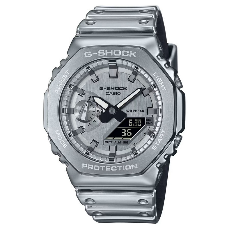 Sportowy zegarek męski Casio G-Shock G-Steel Fine Metallic GM-S2100YM-8AER. Zegarek posiada precyzyjny mechanizm kwarcowy wyposażony w funkcje datownika, stopera, timera i wskazań stref czasowych. Ma możliwość pracy w trybie 12 lub 24 h. Dodatkowo posiada kilka alarmów oraz podświetlenie, dzięki któremu widać doskonale co pokazuje wyświetlacz oraz wskazanie analogowe na tarczy zegarka. Koperta została wykonana ze stali nierdzewnej i kompozytu. Pasek silikonowy. Szerokość koperty wynosi 44,4mm. Utwardzane szkło mineralne. Zegarek jest odporny na wstrząsy i uderzenia, a wodoszczelność 200 metrów pozwala na pływanie i nurkowanie z zegarkiem na nadgarstku. G-STEEL - śmiałość spotyka się z wyrafinowanym blaskiem w monochromatycznej srebrnej kolorystyce. Monochromatyczna estetyka łączy metalową obudowę w kolorze srebrnym z nowo opracowanym wytrzymałym silikonowym paskiem w tym samym kolorze. Powierzchnia paska jest zabezpieczona arkuszem uretanu wykończonym metodą osadzania z fazy gazowej w kolorze srebrnym, aby uzyskać metaliczny połysk paska, który świetnie przylega do skóry. Miękkie i wygodne w noszeniu, o błyszczącym metalicznym wyglądzie, te zegarki to modne przedmioty, które zabiorą Cię, gdziekolwiek chcesz. Wybierz swój ulubiony — kultowy GM-2100 z ośmiokątnym pierścieniem.
