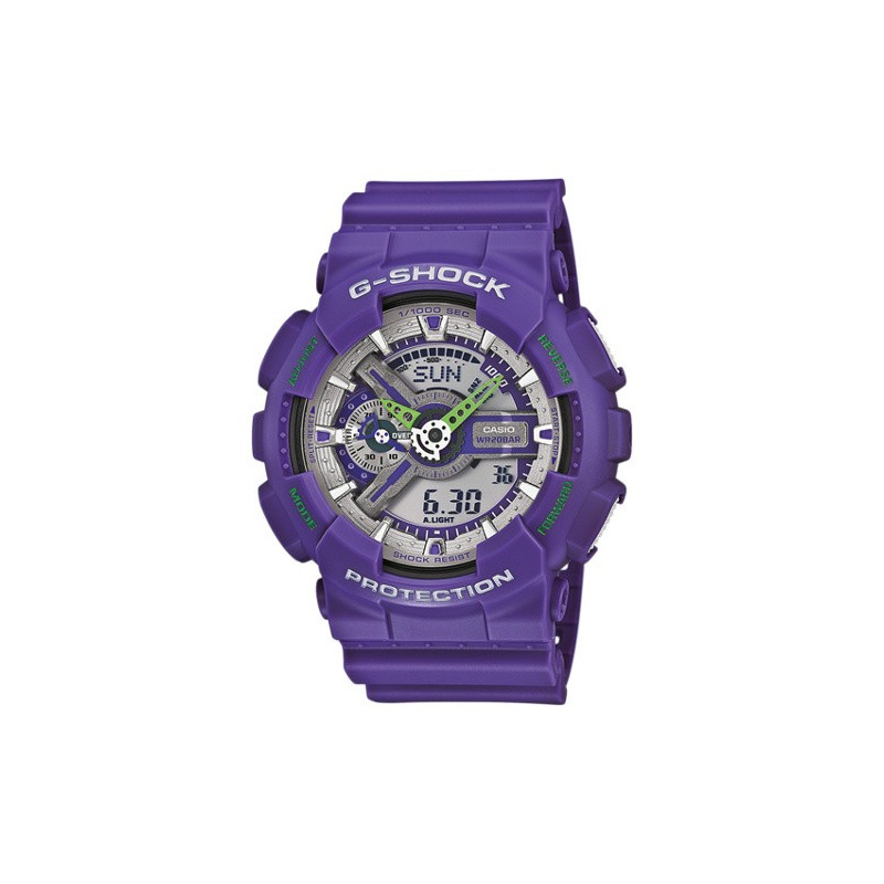 Sportowy zegarek męski Casio G-Shock Original GA-110DN-6AER (GA110DN6AER). Mechanizm kwarcowy analogowo-cyfrowy. Koperta wykonana z tworzywa sztucznego w kolorze fioletowym. Szkło mineralne. Pasek wykonany z tworzywa sztucznego w kolorze fioletowym. Zegarek odporny na wstrząsy oraz działanie pól magnetycznych. Średnica 51mm.