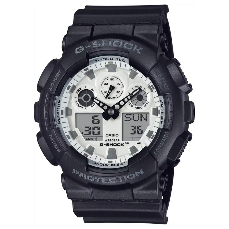 Sportowy zegarek męski CASIO G-Shock Original GA-100WD-1AER. Zegarek posiada precyzyjny, wielofunkcyjny mechanizm kwarcowy wyposażony w funkcję stopera, datownika, czasu światowego, stopera, timera, kliku alarmów oraz podświetlenia. Koperta oraz pasek zostały wykonane z tworzywa sztucznego. Utwardzane szkło mineralne. Szerokość koperty wynosi 51,2 mm. Zegarek jest odporny na wstrząsy i uderzenia, a wodoszczelność wynosząca 200 metrów pozwala na pływanie i nurkowanie z zegarkiem na nadgarstku.