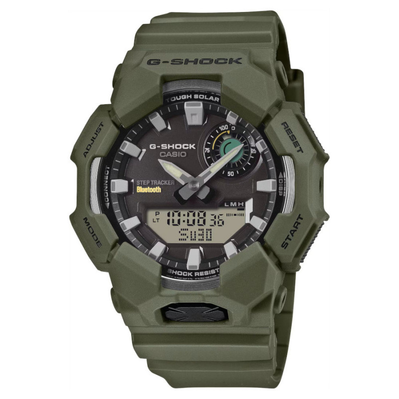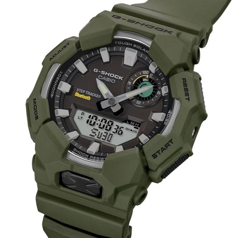 Analogowo-cyfrowy model GA-B010 wyróżnia się dużą kopertą z dużym, czytelnym wyświetlaczem. Wyjątkowo precyzyjne wykończenia – z pierścieniem lunety pokrytym powłoką, tarczą z wykończeniem słonecznym i metalicznym wykończeniem wkładki dodają wartości temu projektowi, który stawia na wytrzymałość. Zegarek potrzebuje jedynie energii słonecznej do zliczania kroków i wyświetlania śledzonych danych na wyświetlaczu cyfrowym. Zegarek przesyła również dane do sparowanego smartfona przez Bluetooth®, zapewniając pełną funkcjonalność na wyciągnięcie ręki. Wystarczy uruchomić aplikację CASIO WATCHES, aby automatycznie i precyzyjnie odmierzać czas oraz łatwo zarządzać dziennikami aktywności z telefonu. Zegarek oferuje przydatne funkcje, takie jak czas światowy i stoper, a także podświetlenie LED o wysokiej jasności, które można włączać i wyłączać dużym przyciskiem z przodu koperty. Indeksy i wskazówki z fosforyzującym wykończeniem zapewniają widoczność nawet w ciemności. Zegarek jest również wykonany z biożywicy, materiału, który ma ograniczyć wpływ na środowisko. Z łatwością zabierzesz go ze sobą na co dzień, jak i na spotkanie biznesowe – to zegarek, którym będziesz się cieszyć przez lata.