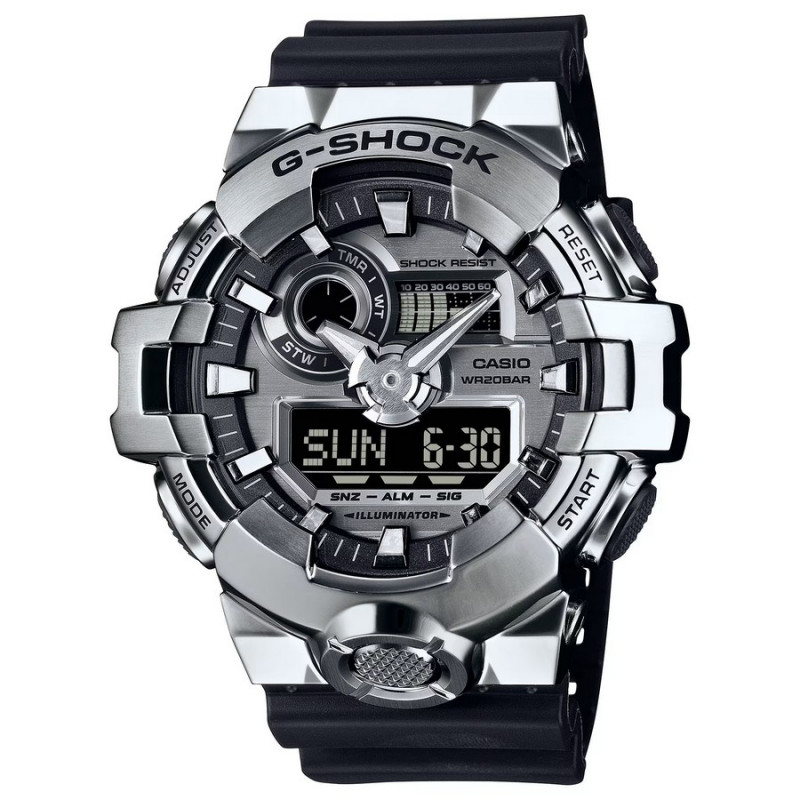 Sportowy zegarek męski Casio G-Shock Original GM-700-1AER. Zegarek posiada precyzyjny wielofunkcyjny mechanizm kwarcowy. Koperta została wykonana z żywicy biopochodnej oraz stali szlachetnej. Pasek został wykonany z żywicy biopochodnej. Szerokość koperty wynosi 53,4mm. Utwardzane szkło mineralne. Zegarek jest odporny na wstrząsy i uderzenia, a wodoszczelność 200 metrów pozwala na pływanie i nurkowanie z zegarkiem na nadgarstku. G-STEEL GM-700, najnowszy model z linii popularnych na całym świecie analogowo-cyfrowych zegarków G-SHOCK z klasyczną dużą kopertą. Odziedziczając solidny, modny design pierścienia ze stali nierdzewnej z modeli GM-5600, GM-6900 i GM-110, GM-700 bazuje na GA-700, przenosząc go na zupełnie nowy teren dzięki metalowemu pierścieniowi w jednym z trzech różnych kolorów. Srebrne i złote pierścienie podkreślają naturalny, odważny wygląd metali, które projektują. Uderzający wygląd fioletowo-czarnego pierścienia uzyskano dzięki fioletowym akcentom na tle czarnej powłoki jonowej. Konstrukcja przedniego przycisku ułatwia dostęp do światła LED, które oświetla tarczę, zapewniając wysoką widoczność i łatwość odczytu w nocy i w ciemnych miejscach.