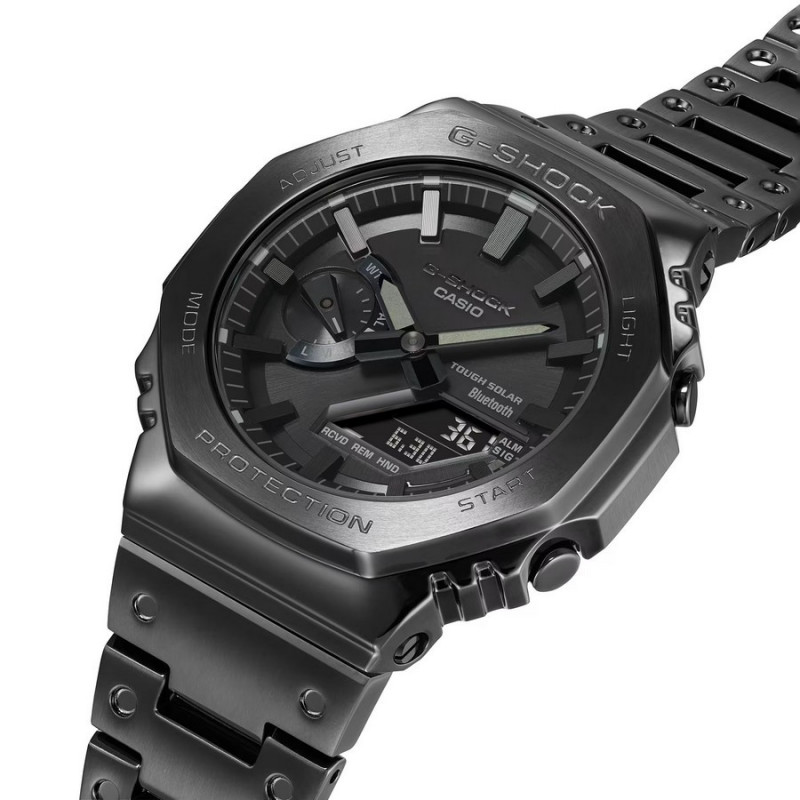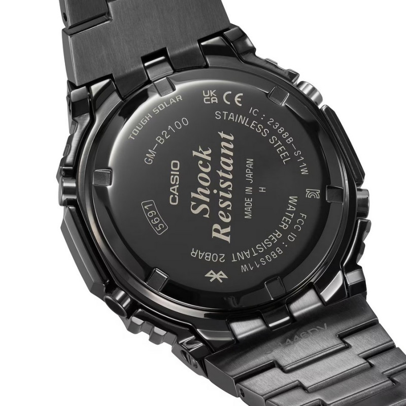 Japoński sportowy zegarek męski Casio G-Shock Full Metal seria 2100 GM-B2100BD-1AER. Zegarek posiada precyzyjny mechanizm kwarcowy wyposażony w funkcje datownika, stopera, timera i wskazań stref czasowych. Ma możliwość pracy w trybie 12 lub 24 h. Dodatkowo posiada kilka alarmów oraz podświetlenie, dzięki któremu widać doskonale co pokazuje wyświetlacz oraz wskazanie analogowe na tarczy zegarka. Zasilanie jest realizowane przez ogniwo słoneczne. Dzięki łączności Bluetooth może łączyć się ze smartfonem. Koperta oraz bransoleta została wykonana ze stali szlachetnej pokrytej powłoką IP w kolorze czarnym. Utwardzane szkło mineralne. Szerokość koperty wynosi 44,4 mm. Zegarek jest odporny na wstrząsy i uderzenia, a wodoszczelność 200 metrów pozwala na pływanie i nurkowanie z zegarkiem na nadgarstku. Made in Japan.