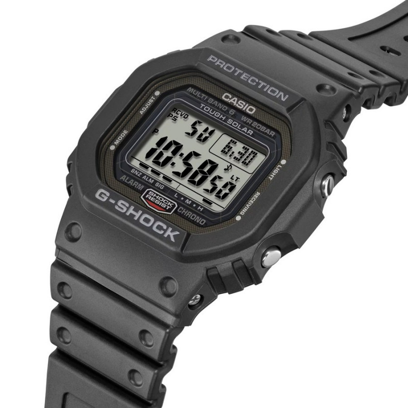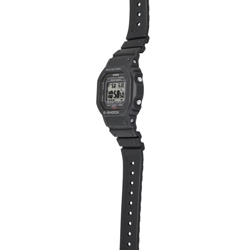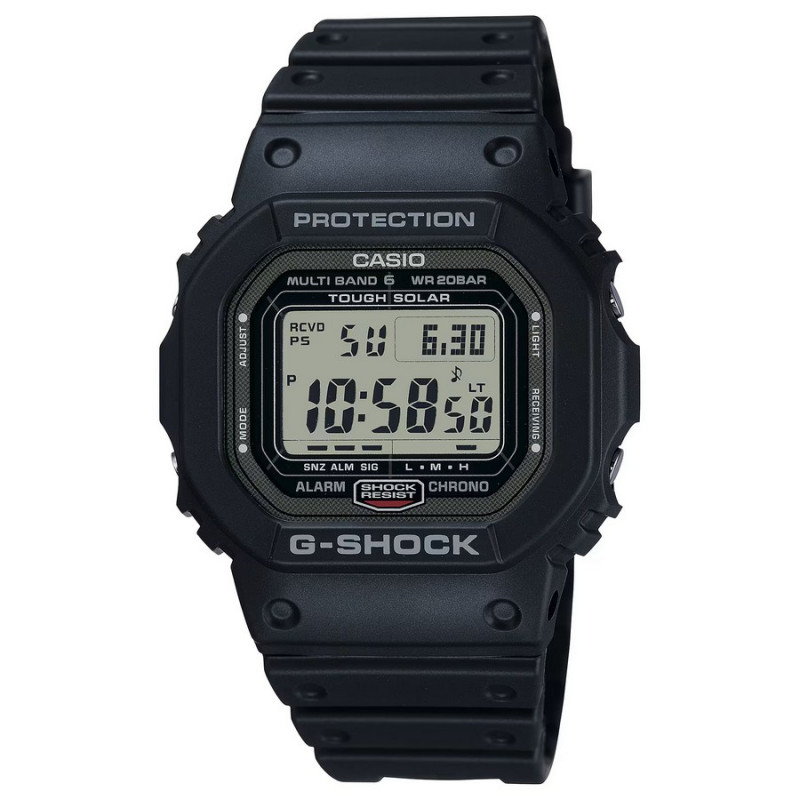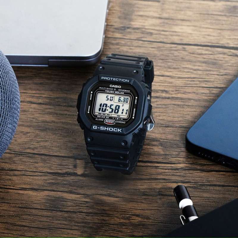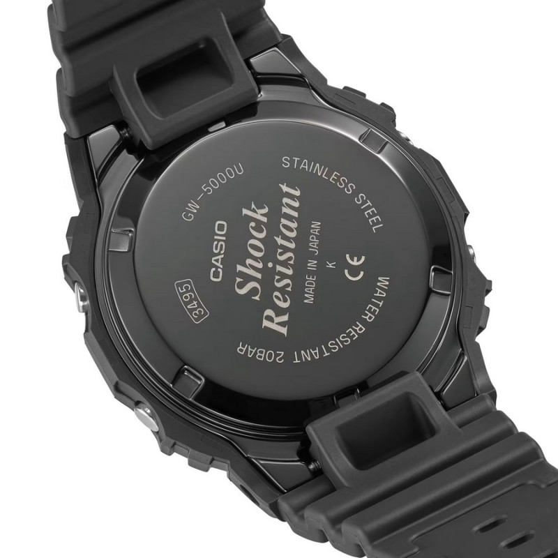 Japoński sportowy zegarek męski Casio G-Shock Original GW-5000U-1ER (GW5000U1ER). Zegarek posiada precyzyjny, wielofunkcyjny mechanizm kwarcowy zasilany światłem i aktualizujący czas drogą radiową od zegarów atomowych. Koperta została wykonana ze stali szlachetnej pokrytej powłoką DLC oraz tworzywa sztucznego. Neoprenowy pasek z domieszką komponentów organicznych. Utwardzane szkło mineralne. Szerokość koperty wynosi 42,8mm. Zegarek jest odporny na wstrząsy i uderzenia, a wodoszczelność wynosząca 200 metrów pozwala na pływanie i nurkowanie z zegarkiem na nadgarstku. Model wyprodukowany w Japonii.