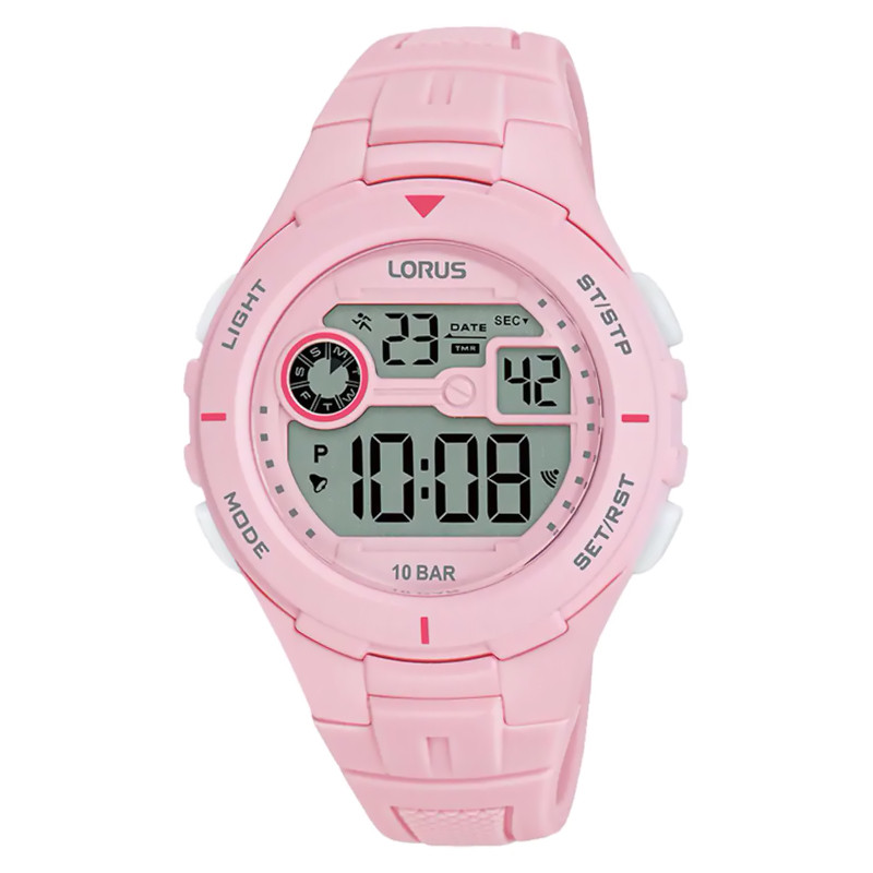 Japoński sportowy zegarek dziecięcy Lorus R2387PX9. Model z wielofunkcyjnym mechanizmem kwarcowym. Koperta została wykonana z tworzywa sztucznego. Różowy pasek został wykonany z silikonu. Wyświetlacz chroni szkło hesalitowe. Szerokość koperty wynosi 36mm. Klasa wodoszczelności tego modelu wynosi 10ATM.