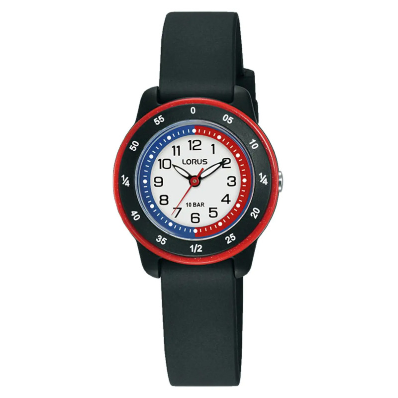 Japoński zegarek dziecięcy Lorus RRX51JX9. Model z mechanizmem kwarcowym. Koperta została wykonana z tworzywa sztucznego. Czarny pasek został wykonany z tworzywa sztucznego. Białą, czytelną tarczę chroni szkło hesalitowe. Średnica koperty wynosi 26mm. Klasa wodoszczelności tego modelu wynosi 10ATM.