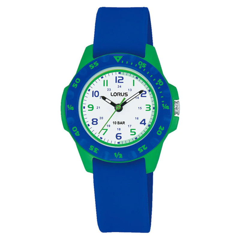 Dziecięcy zegarek Lorus RRX63JX9. Model z mechanizmem kwarcowym. Koperta została wykonana z tworzywa sztucznego. Granatowy pasek został wykonany z tworzywa sztucznego. Białą tarczę chroni szkło hesalitowe. Średnica koperty wynosi 29mm natomiast grubość 10mm. Klasa wodoszczelności tego modelu wynosi 10ATM.