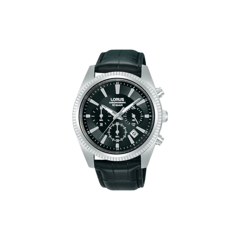 Sportowy zegarek męski Lorus Chronograph RT301LX9. Model z mechanizmem kwarcowym z komplikacją chronografu oraz datownikiem. Koperta została wykonana ze stali szlachetnej. Czarny pasek został uszyty ze skóry naturalnej. Czarną tarczę chroni szkło mineralne. Średnica koperty wynosi 42mm. Klasa wodoszczelności tego modelu wynosi 10ATM.