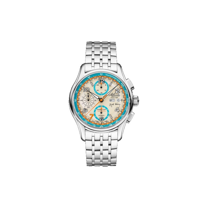 Szwajcarski zegarek męski Atlantic Worldmaster World Cup Limited Edition Krzysztof Hołowczyc 55858.41.29LE. Model z mechanizmem automatycznym z 48 godzinna rezerwą chodu z komplikacją chronografu. Koperta została wykonana ze stali szlachetnej. Bransoleta została wykonana ze stali szlachetnej. Beżową tarczę chroni najtwardsze, odporne na zarysowania szkło szafirowe z powłoką antyrefleksyjną. Średnica koperty wynosi 42mm. Klasa wodoszczelności tego modelu wynosi 5ATM. Model ten wysyłany jest w limitowanym pudełku sygnowanym podpisem Krzysztofa Hołowczyca. W zestawie dodatkowo wymienny, skórzany pasek oraz podróżne skórzane etui. Zegarek pochodzi ze ściśle limitowanej edycji do 277 sztuk.