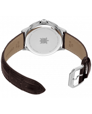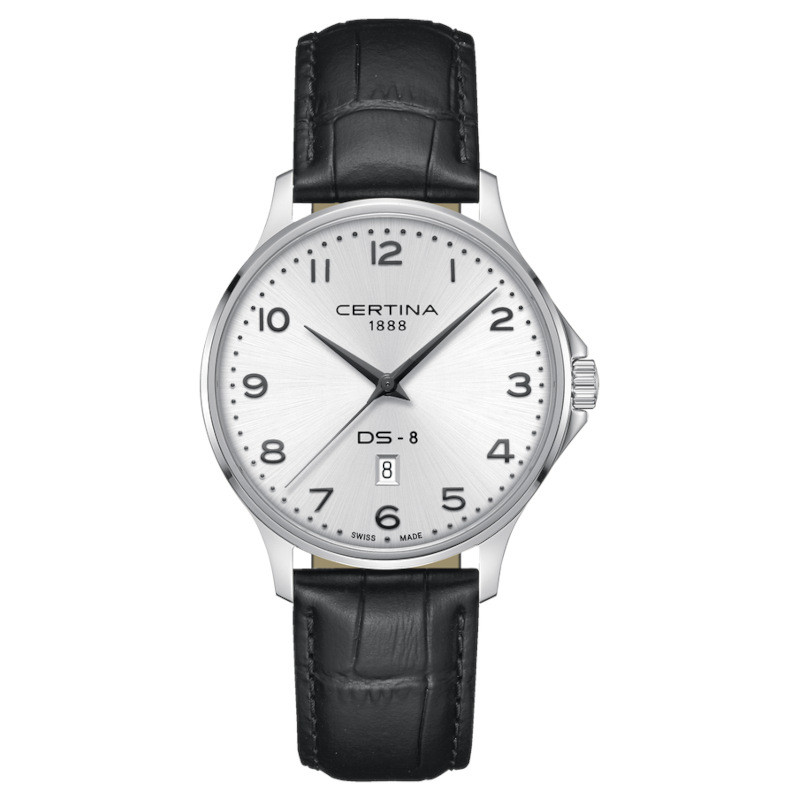 Szwajcarski klasyczny zegarek męski Certina DS-8 C045.410.16.032.00. Model z precyzyjnym szwajcarskim mechanizmem kwarcowym Precidrive z komplikacją datownika. Koperta została wykonana ze stali szlachetnej. Czarny pasek został uszyty ze skóry naturalnej. Srebrną tarczę chroni najtwardsze, odporne na zarysowania szkło szafirowe z wewnętrzną powłoką antyrefleksyjną. Średnica koperty wynosi 40mm natomiast grubość 8,35mm. Klasa wodoszczelności tego modelu wynosi 10ATM.