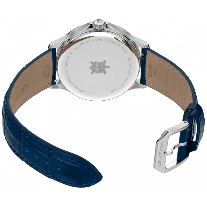 Szwajcarski klasyczny zegarek męski Certina DS-8 C045.410.16.041.00. Model z precyzyjnym szwajcarskim mechanizmem kwarcowym Precidrive z komplikacją datownika. Koperta została wykonana ze stali szlachetnej. Granatowy pasek został uszyty ze skóry naturalnej. Granatową tarczę chroni najtwardsze, odporne na zarysowania szkło szafirowe z wewnętrzną powłoką antyrefleksyjną. Średnica koperty wynosi 40mm natomiast grubość 8,35mm. Klasa wodoszczelności tego modelu wynosi 10ATM.